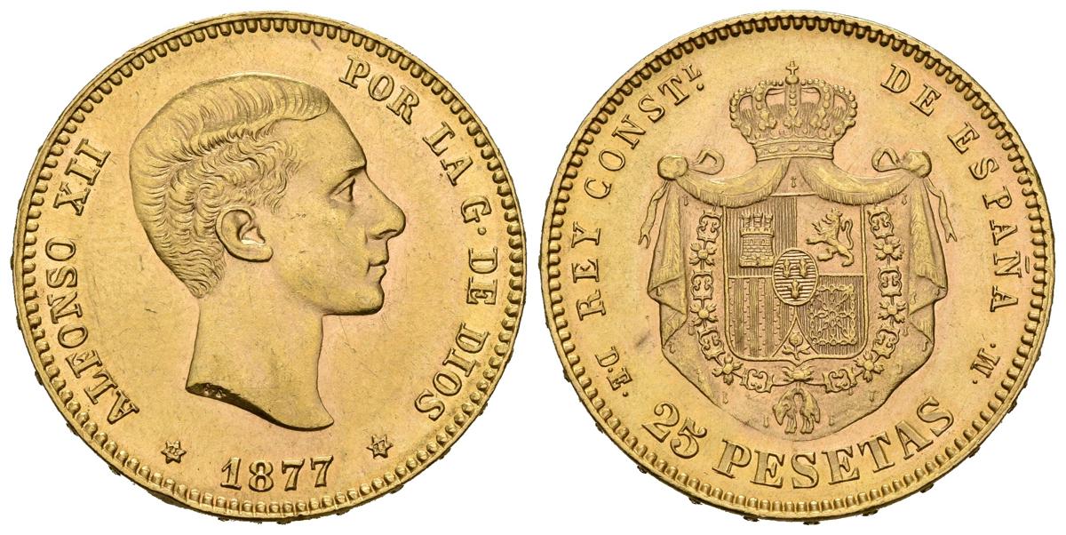 ALFONSO XII (1874-1885). 25 Pesetas. (Au. 8,06g/24mm). 1877 *18-77. Madrid DEM. (Cal-2019-68). EBC+. Golpecito en canto.