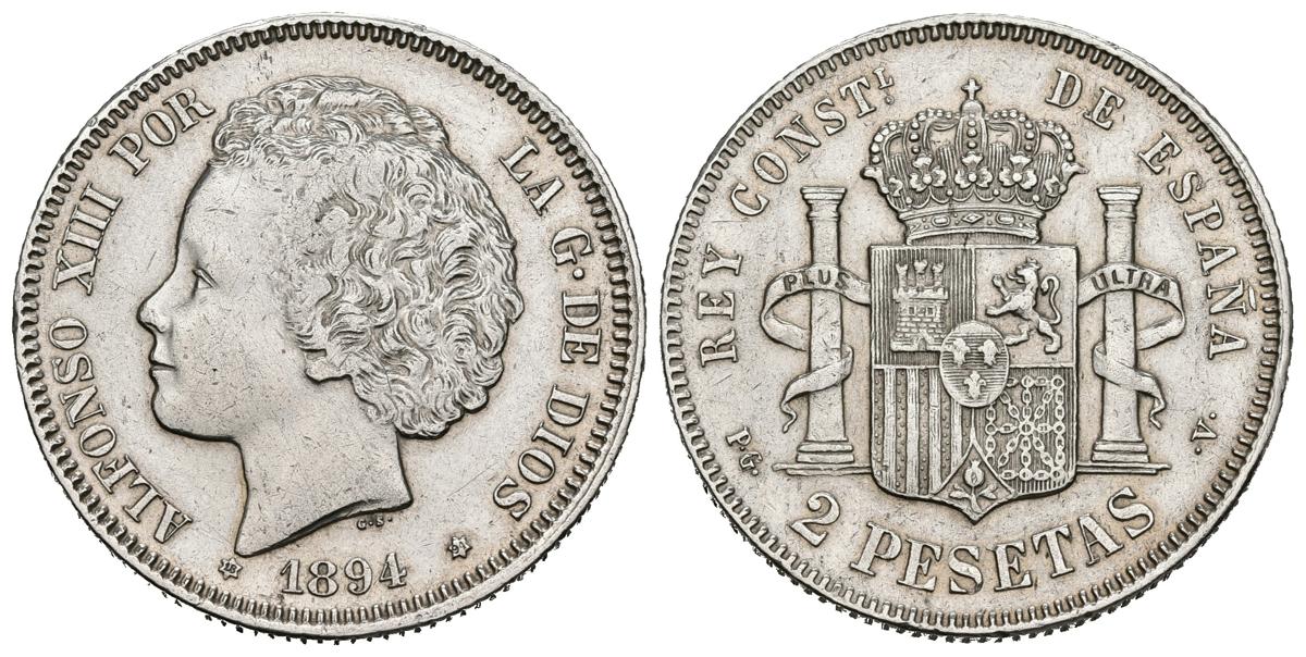 ALFONSO XIII (1885-1931). 2 Pesetas. (Ar. 10,01g/26mm). 1894 *18-94. Madrid PGV. (Cal-2019-86). MBC+.