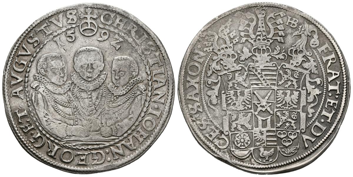 ALEMANIA. Thaler (Ar. 28,57g/41mm). 1592. (Km#314). Sajonia. Cristian II, Augusto y Juan Jorge I. EBC-