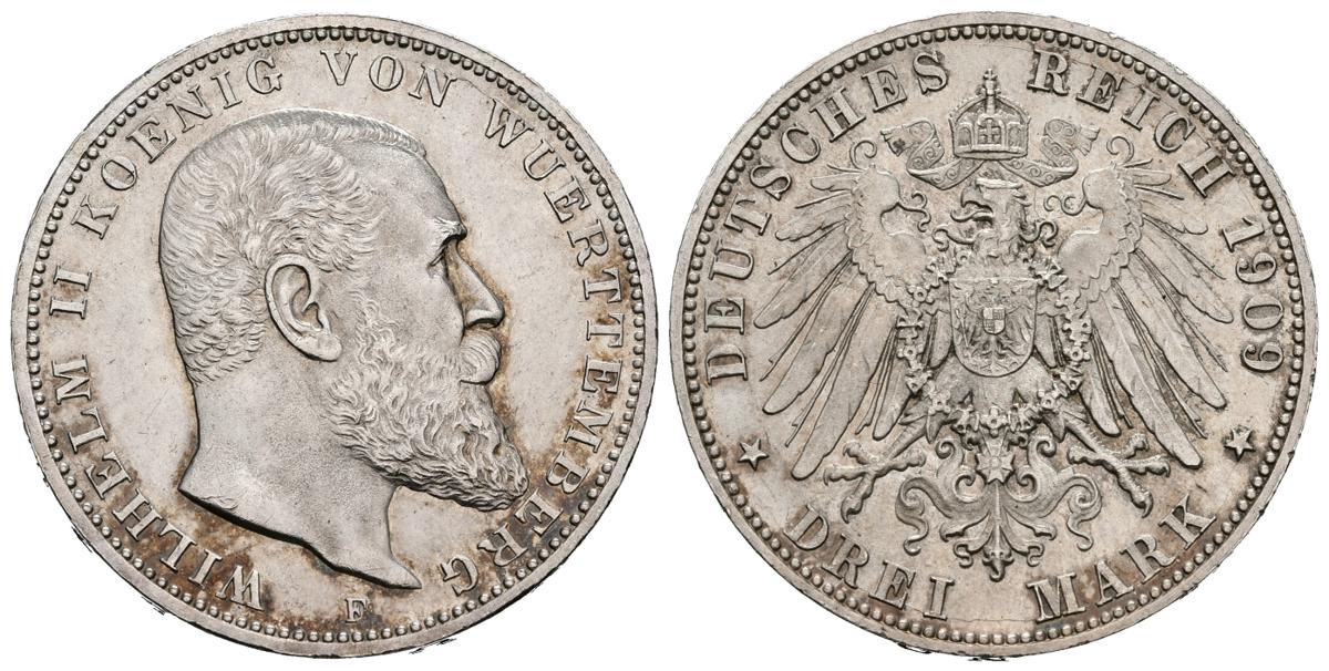 ALEMANIA. 3 Marcos (Ar. 16,65g/32,9mm). 1909. Wurtemberg. (KM#635). EBC.