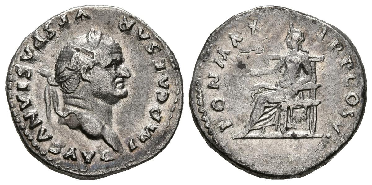 VESPASIANO. Denario. (Ar. 3,13g/19mm). 75 d.C. Roma. (RIC 772). MBC+/MBC. Golpe en anverso.