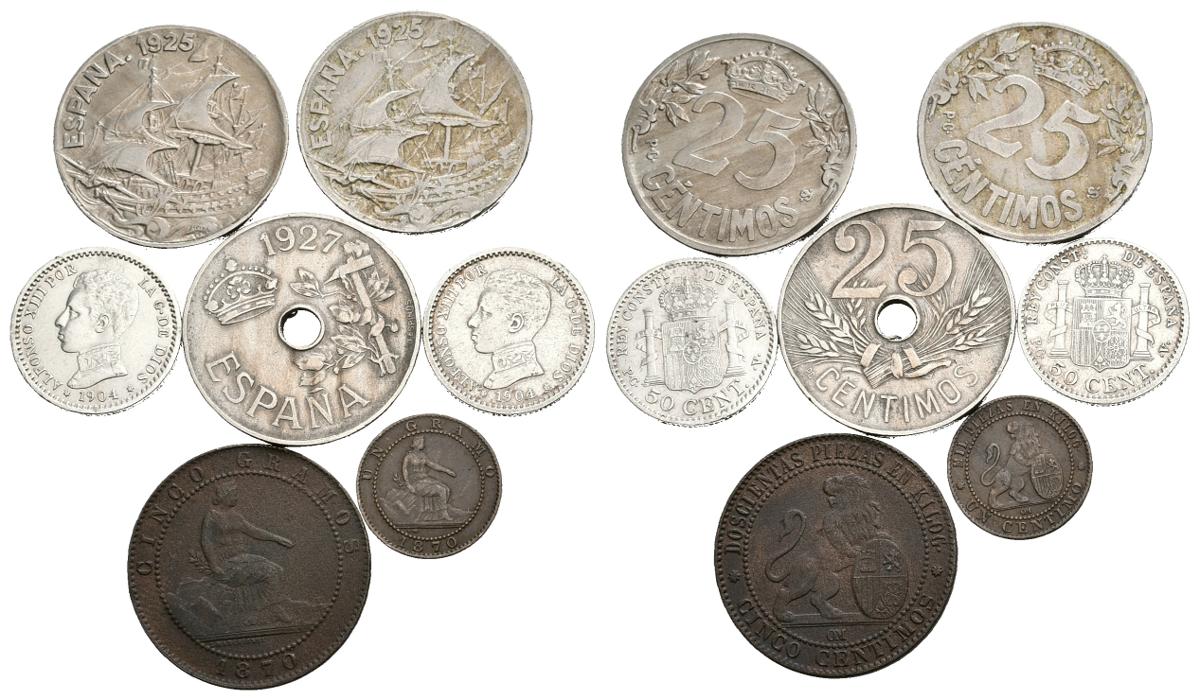 CENTENARIO DE LA PESETA. Lote compuesto por 7 monedas del Gobierno Provisional y Reinado de Alfonso XIII . Incluye dos piezas de 50 céntimos de plata. Diferentes estados de conservación. A EXAMINAR.