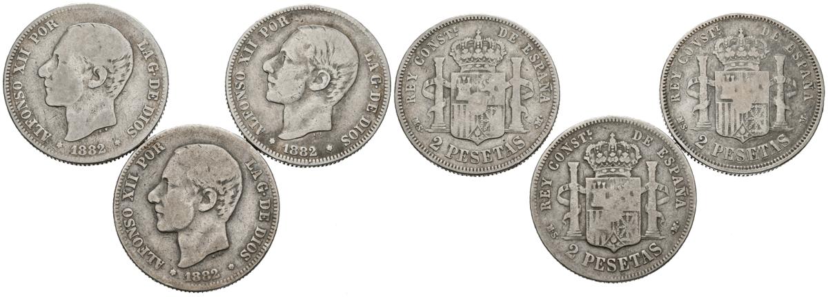 CENTENARIO DE LA PESETA. Conjunto de 3 monedas de 2 Pesetas de 1882 de la ceca de Madrid. A EXAMINAR.