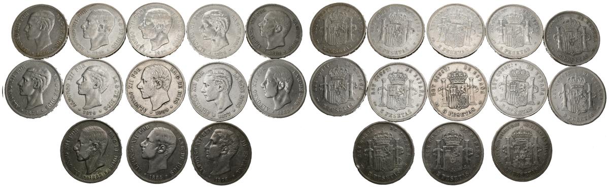 CENTENARIO DE LA PESETA. Conjunto de 13 monedas de 5 pesetas del reinado de Alfonso XII. Diferentes años de acuñación así como estados de conservación. A EXAMINAR.