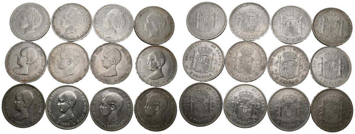 CENTENARIO DE LA PESETA. Conjunto de 12 monedas de 5 Pesetas del reinado de Alfonso XIII. Diferentes bustos, fechas y estados de conservación. A EXAMINAR.