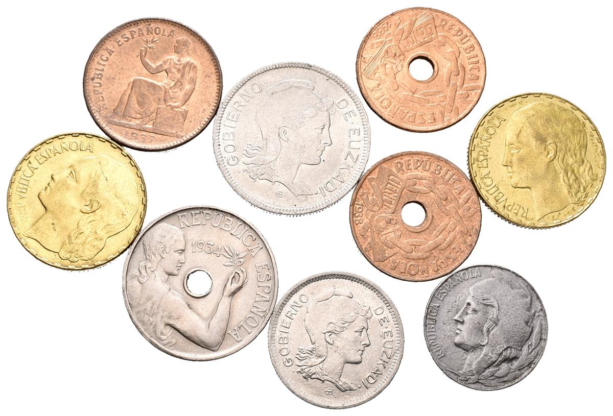 II REPUBLICA. Conjunto de 9 monedas de diferentes valores, materiales y estados de conservación. A EXAMINAR.
