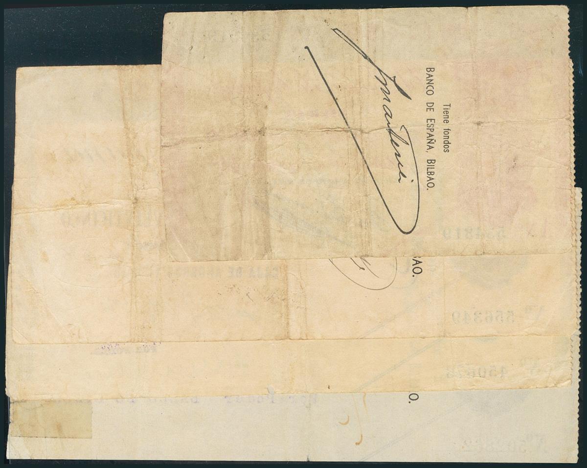 Serie completa de 4 billetes de 5 Pesetas, 25 Pesetas, 50 Pesetas y 100 Pesetas, de talones emitidos a partir del 30 de Enero de 1936 por el Banco de España en Bilbao (Edifil 2017: 368A, 369, 370, 371). BC.