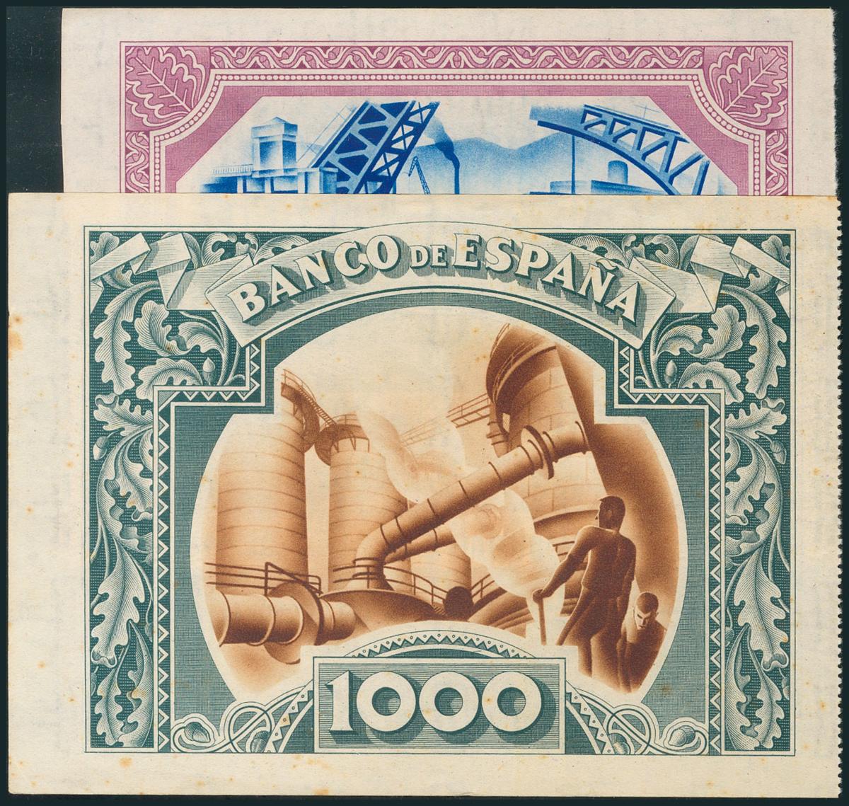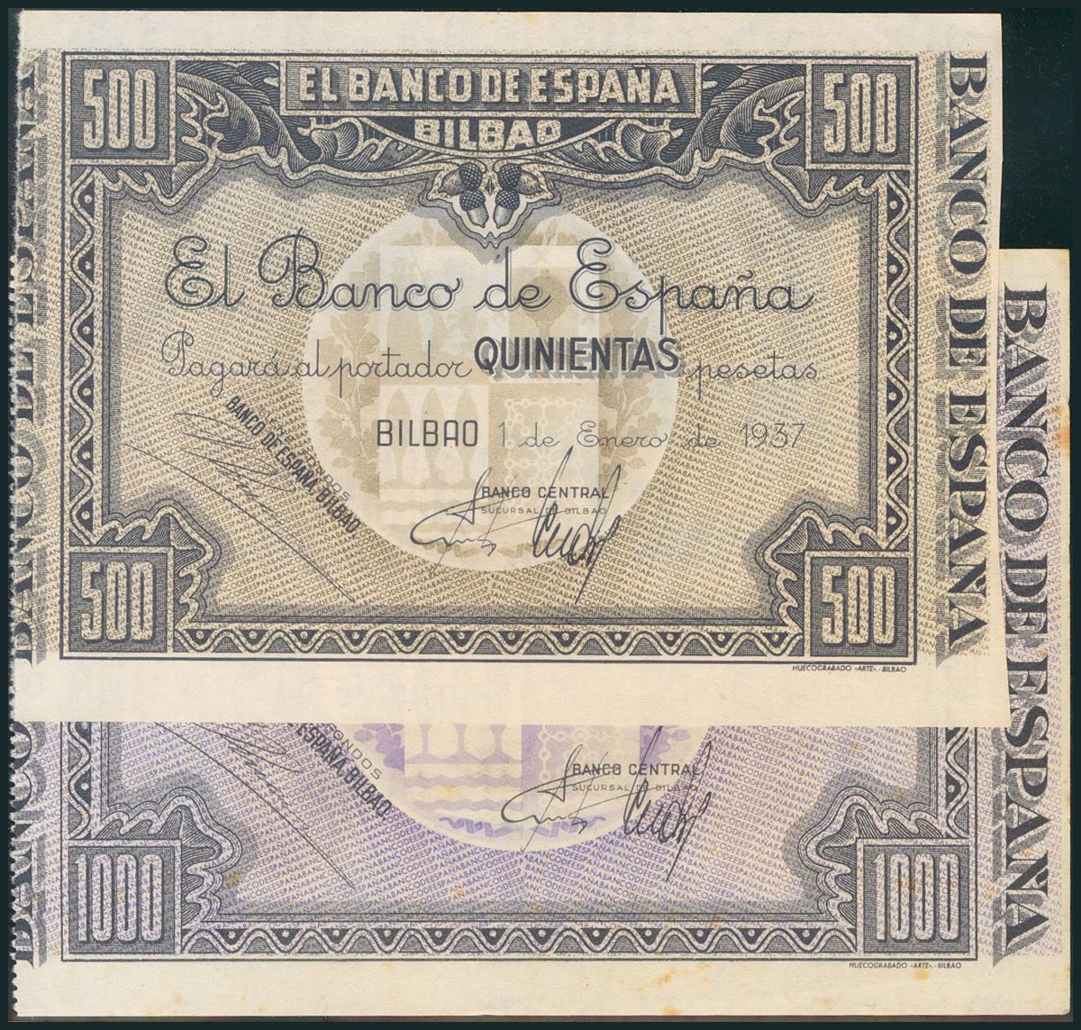 500 Pesetas y 1000 Pesetas NO EMITIDOS. 1 de Enero de 1937. Sin numeración y sin matrices. (Edifil 2017: NE26b, NE27b). Apresto original, el billete de 1000 pts con los habituales puntitos de óxido. EBC+.