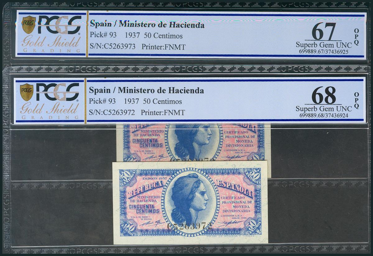 50 Céntimos. 1937. Pareja correlativa. Serie C, última serie emitida. (Edifil 2017: 391a). Encapsulados PCGS68OPQ/67OPQ. SC.