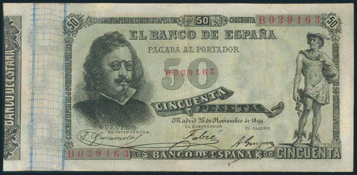 50 Pesetas. 25 de Noviembre de 1899. Serie B. (Edifil 2017: 307a). Mínimamente restaurado. MBC.
