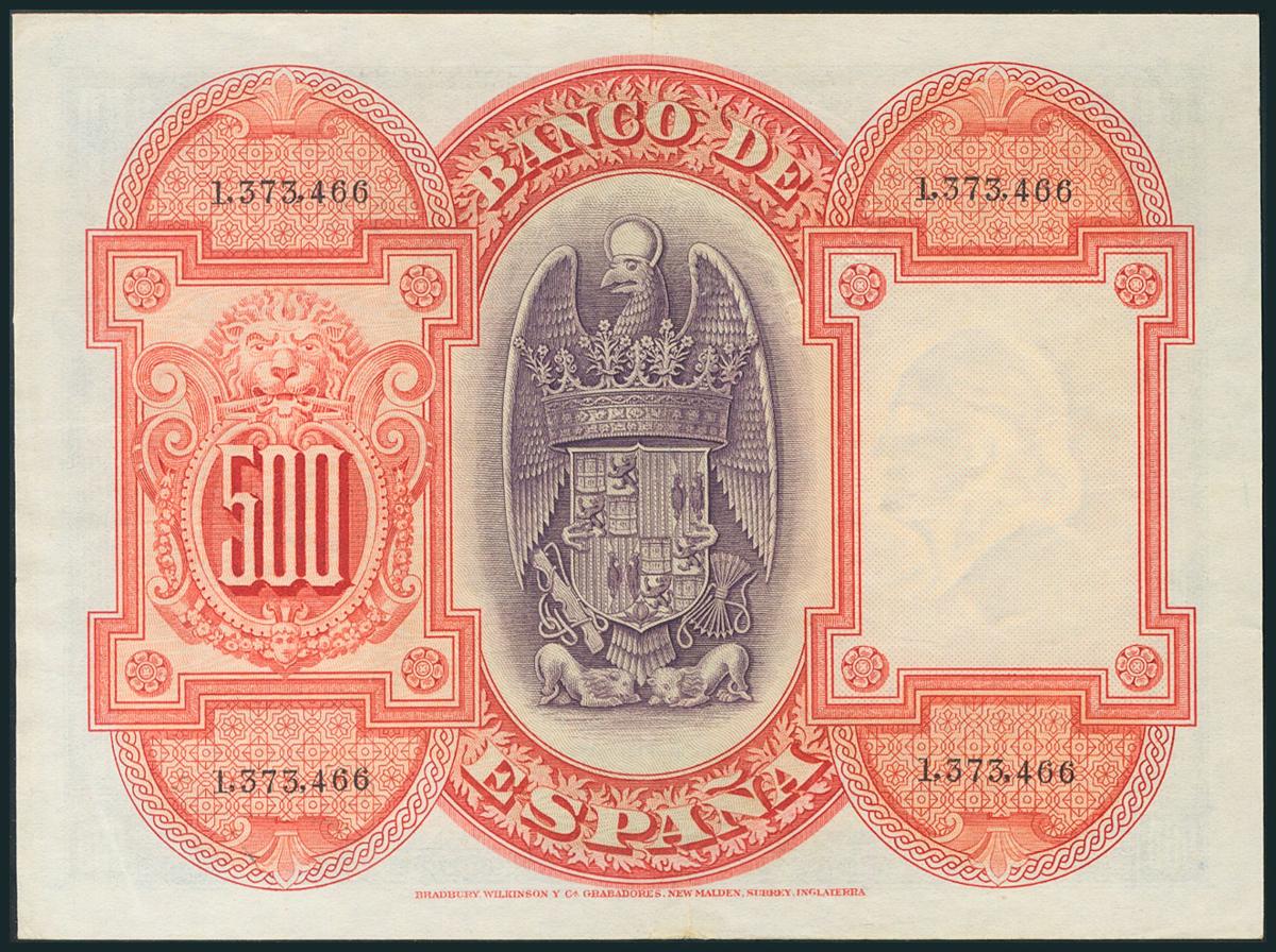 500 Pesetas. 24 de Julio de 1927. Sin serie y anterior a la numeración 1.602.000, con el sello en seco ESTADO ESPAÑOL / BURGOS. (Edifil 2017: 413). Raro. EBC.