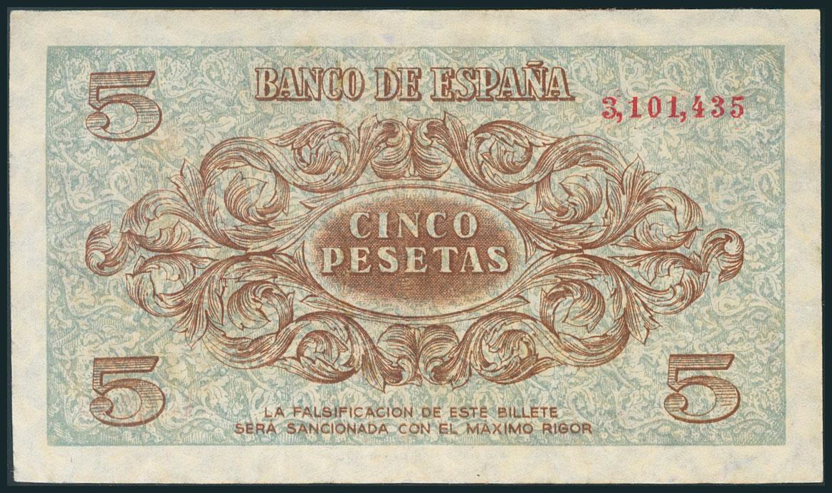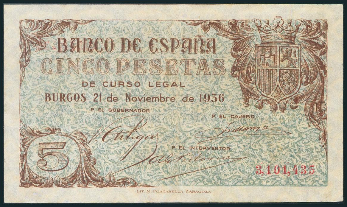 5 Pesetas. 21 de Noviembre de 1936. Sin serie. (Edifil 2017: 417). Inusual. EBC-.