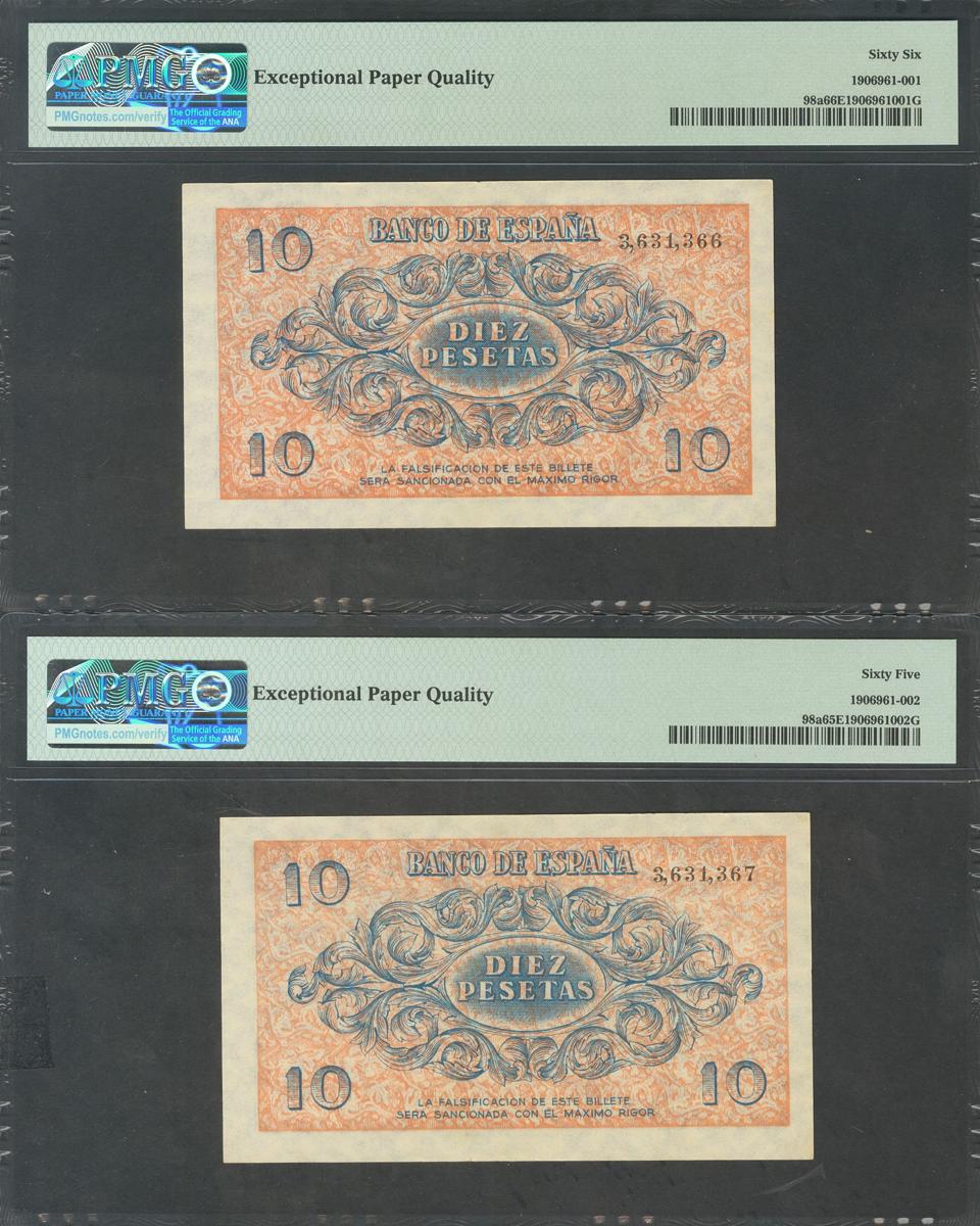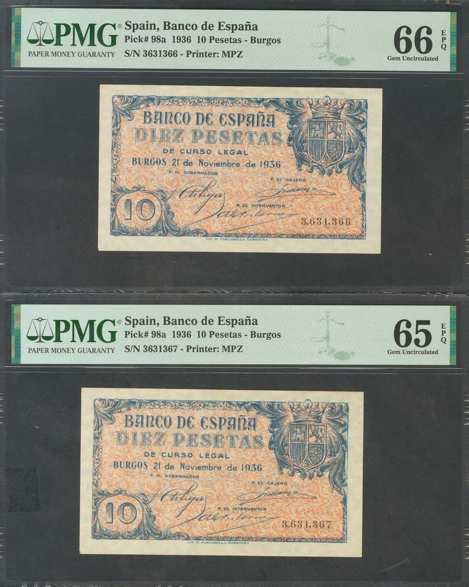 10 Pesetas. 21 de Noviembre de 1936. Pareja correlativa. Sin serie. (Edifil 2017: 418). Extraordinariamente rara. SC. Encapsulados PMG65EPQ/66EPQ (ambas son las máximas graduaciones otorgadas por PMG a cualquiera de estos billetes).El estallido de la guerra civil propició la inmediata división del Banco de España en dos instituciones completamente independientes, una por cada bando. Por este mismo motivo se produjo un efecto colateral: la mutua anulación del dinero legal del “otro”, el cual quedaba automáticamente no reconocido. Por parte del bando nacional, fue el Consejo de Burgos quien acordó la emisión de billetes nuevos. A partir de marzo de 1937, se ordenó el canje directo de los billetes republicanos por los nacionales, así como el de los estampillados en circulación.La pareja correlativa de diez pesetas, aun con fecha de emisión de 21 de noviembre de 1936, fue puesta circulación el 14 de junio de 1937 y muestran unos diseños sobrios y sencillos. Para la fabricación de este billete se utilizó el sistema offset.Fuente. Antonio Amat, Enciclopedia de billetes de España.