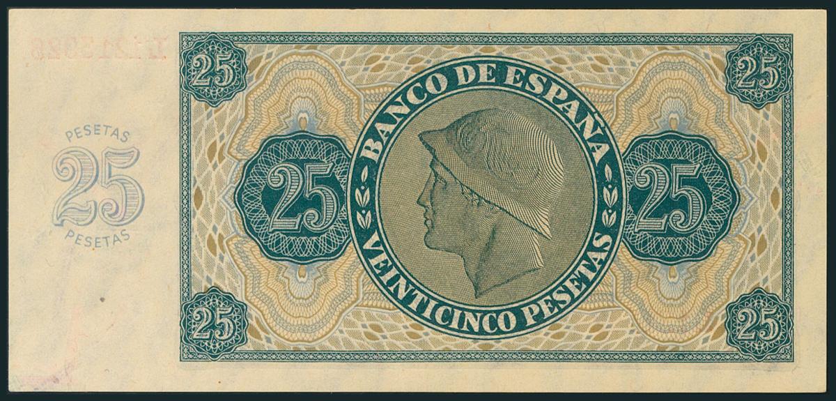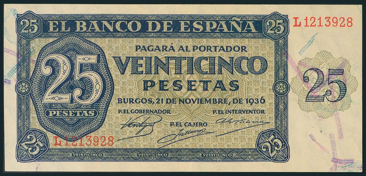 25 Pesetas. 21 de Noviembre de 1936. Serie L. (Edifil 2017: 419a). Apresto original. SC.