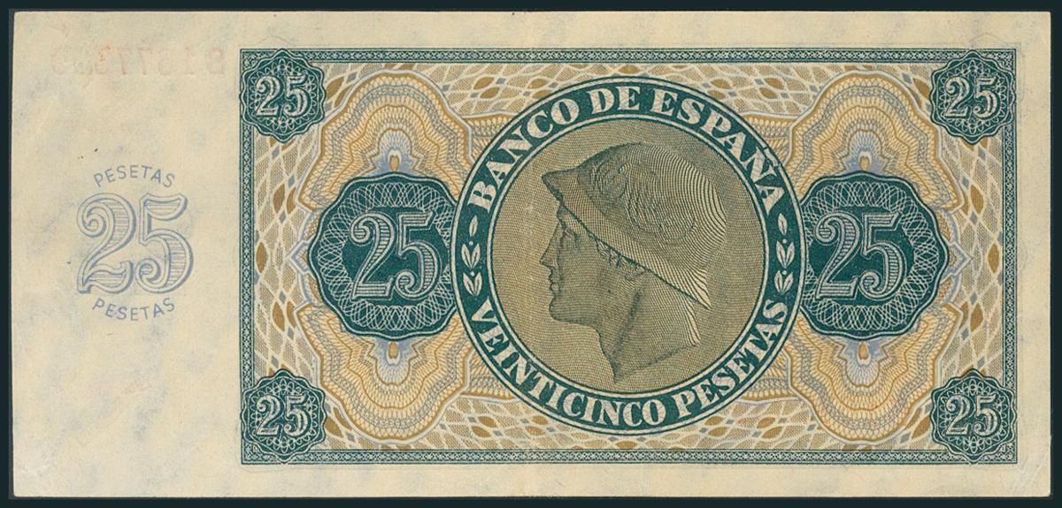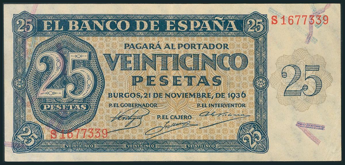 25 Pesetas. 21 de Noviembre de 1936. Serie S, última serie emitida. (Edifil 2017: 419a). EBC.