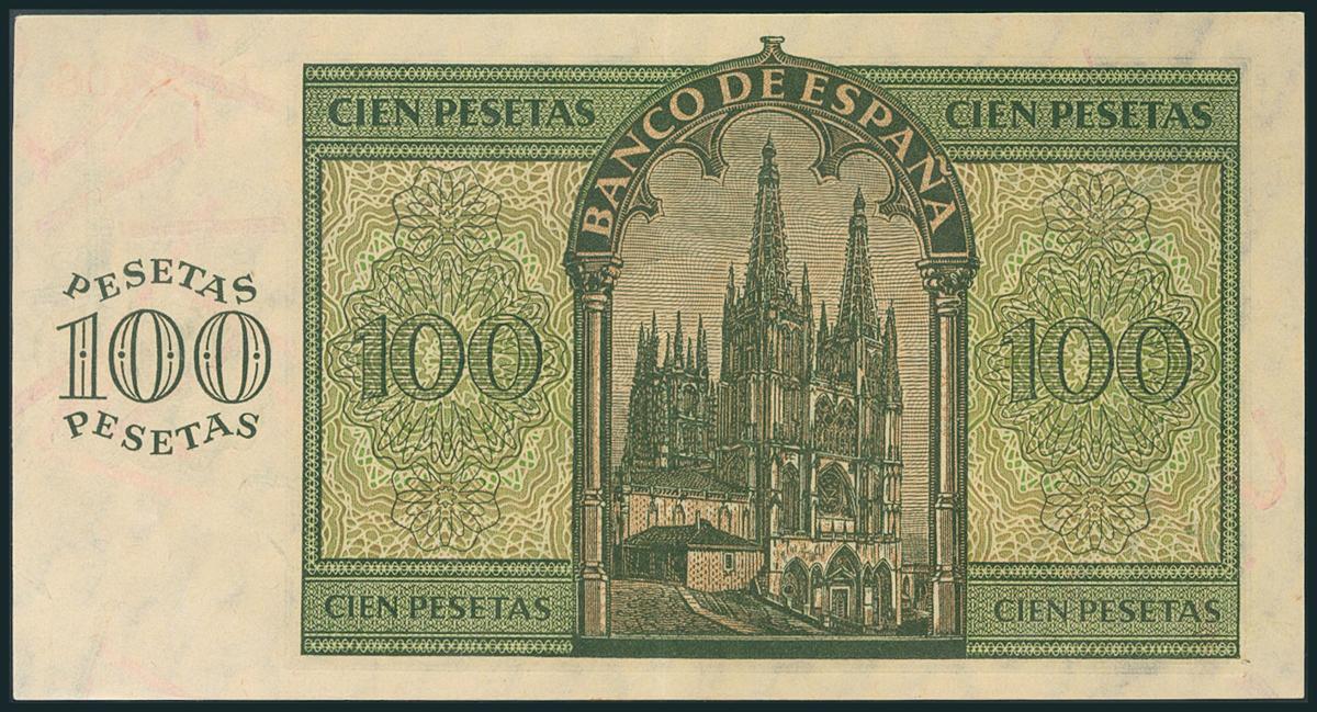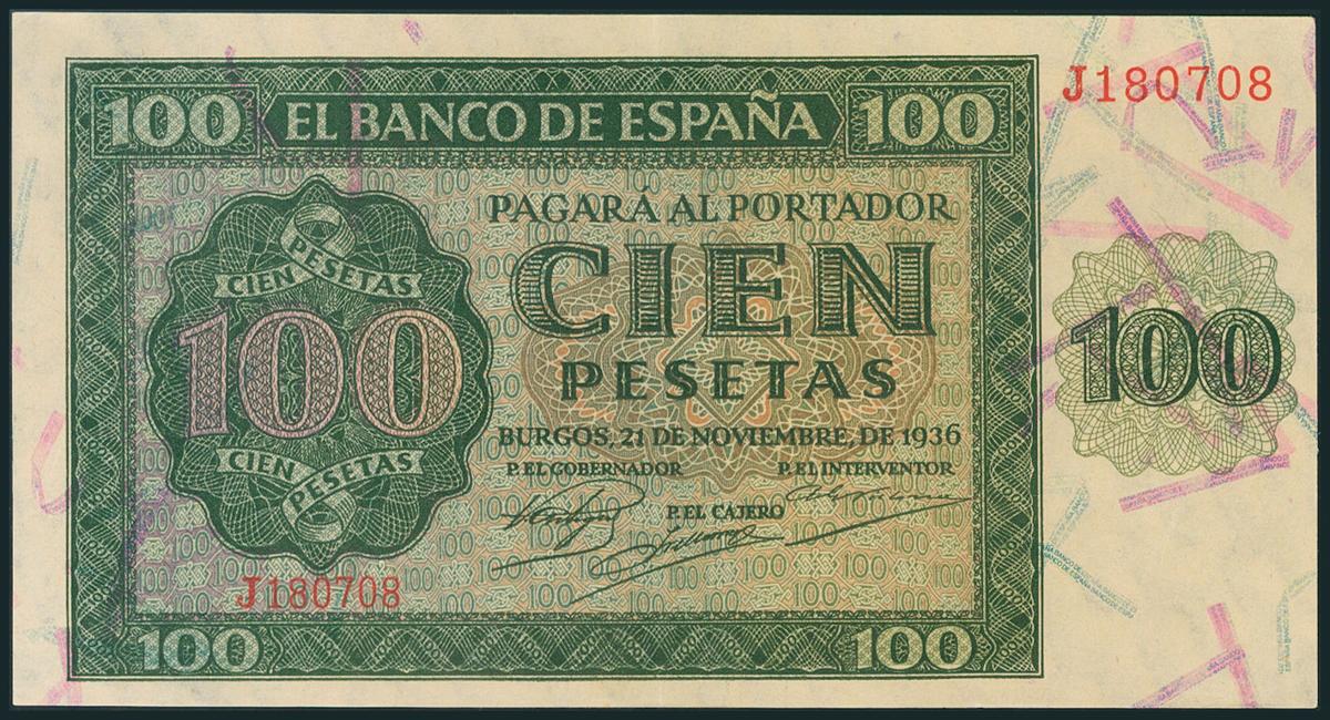 100 Pesetas. 21 de Noviembre de 1936. Serie J. (Edifil 2017: 421a). Conserva gran parte del apresto original. EBC.