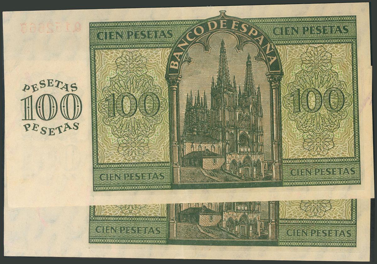 100 Pesetas. 21 de Noviembre de 1936. Banco de España, Burgos. Serie Q. Pareja correlativa. (Edifil 2017: 421a). Apresto original. EBC+.