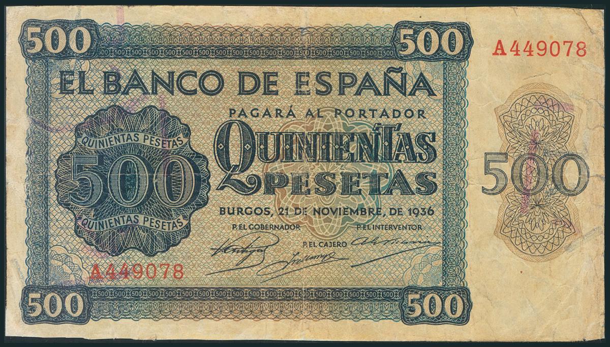 500 Pesetas. 21 de Noviembre de 1936. Serie A. (Edifil 2017: 422a). Reparaciones. RC.