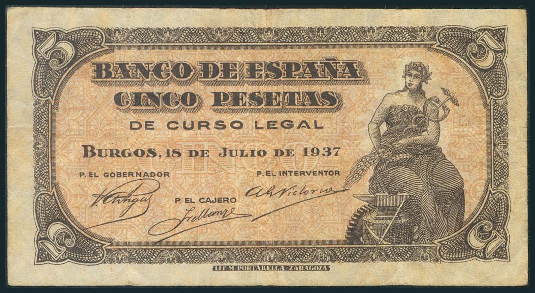 5 Pesetas. 18 de Julio de 1937. Sin serie. (Edifil 2017: 424). MBC.