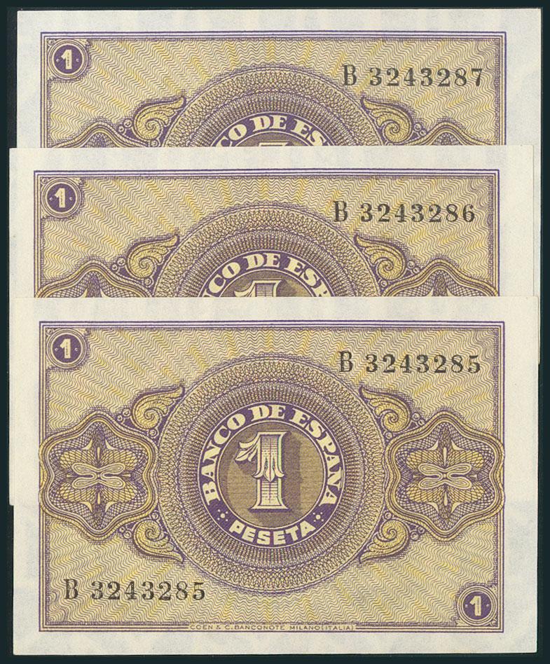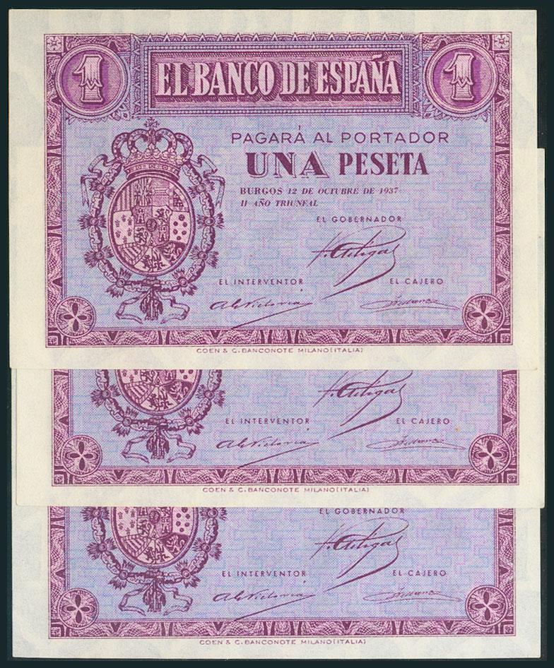 1 Peseta. 12 de Octubre de 1937. Trío correlativo. Serie B. (Edifil 2017: 425a). Apresto original. SC.