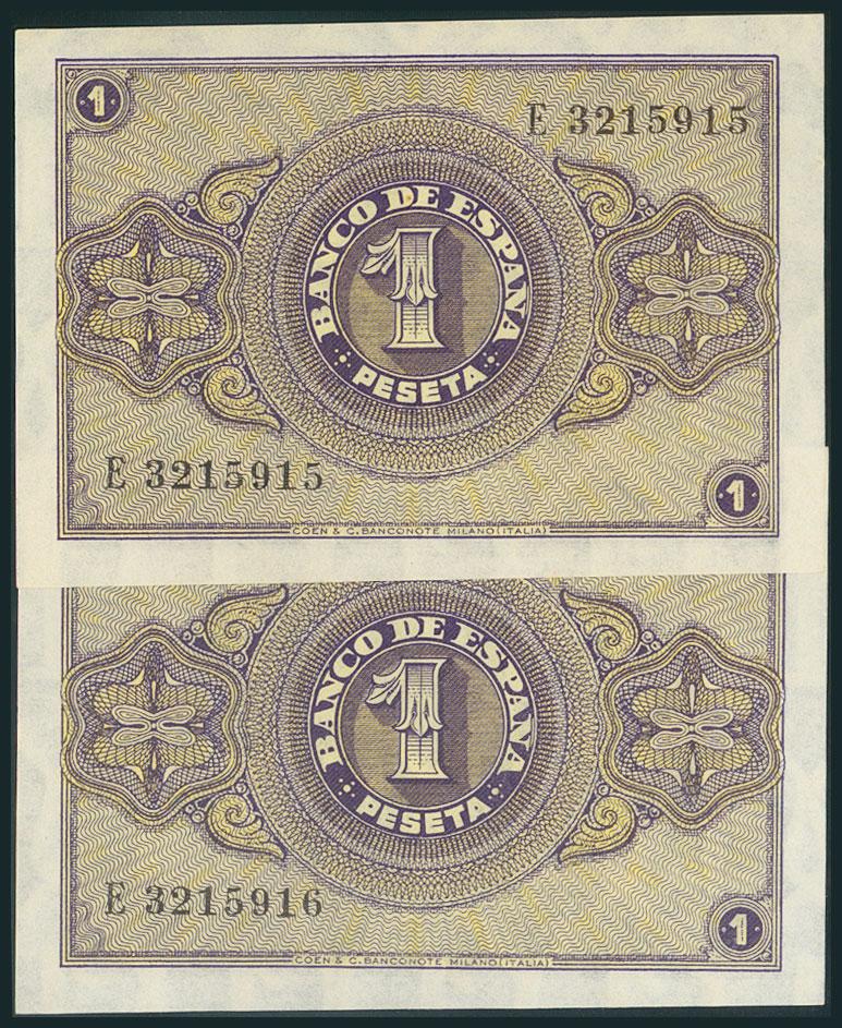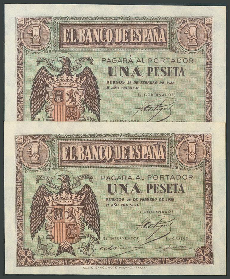 1 Peseta. 28 de Febrero de 1938. Pareja correlativa. Serie E. (Edifil 2017: 427a). Apresto original. SC.