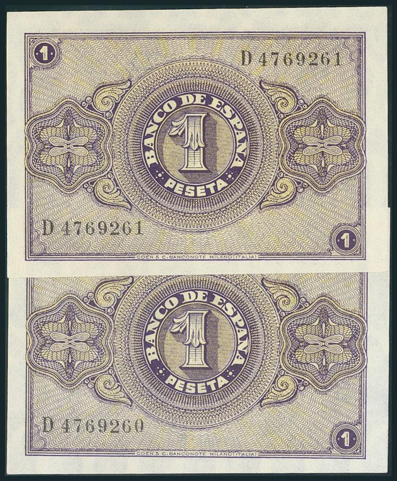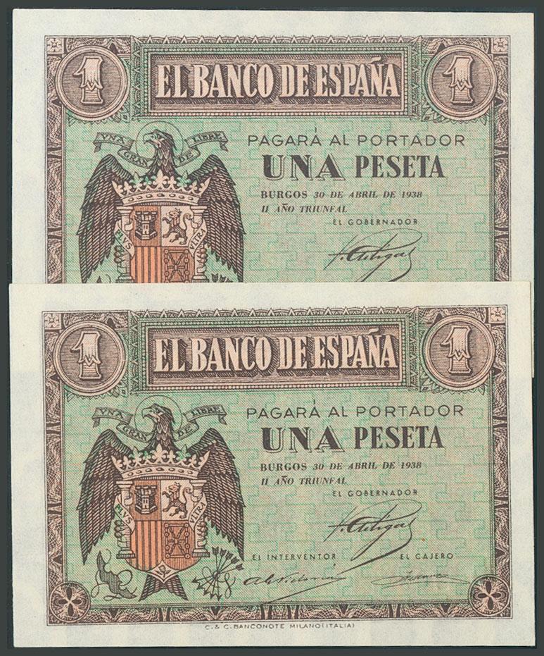 1 Peseta. 30 de Abril de 1938. Pareja correlativa. Serie D. (Edifil 2017: 428a). Apresto original. SC.