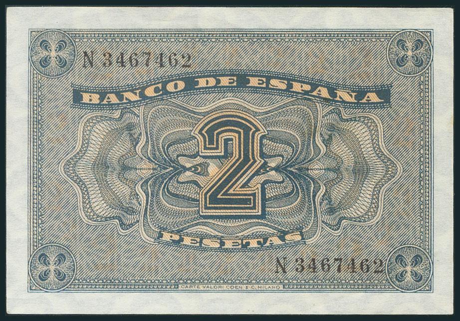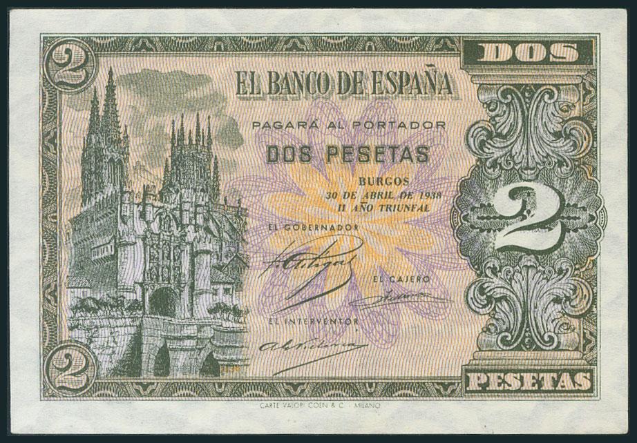 2 Pesetas. 30 de Abril de 1938. Serie N, última serie emitida. (Edifil 2017: 429a). EBC+.