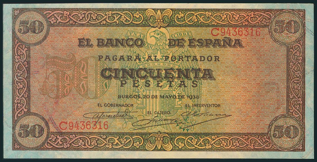 50 Pesetas. 20 de Mayo de 1938. Serie C. (Edifil 2017: 431a). Apresto original. EBC+.