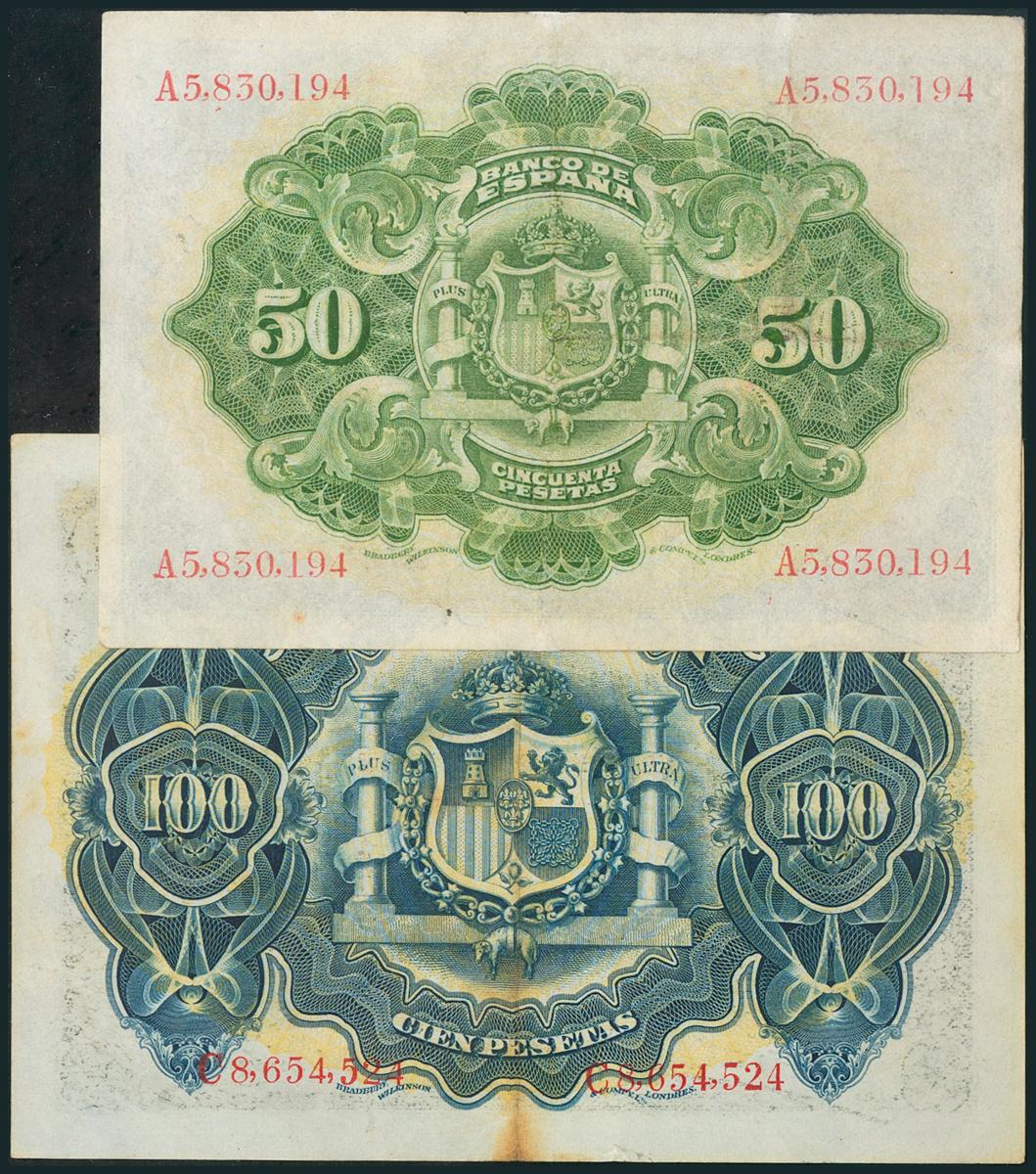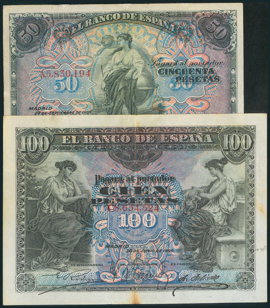 Conjunto de dos billtes de 50 Pesetas serie A y 100 Pesetas serie C, emitidos el 24 de Septiembre de 1906 y 30 de Junio de 1906, respectivamente. (Edifil 2017: 315a, 313a). Alguna reparación. MBC+/MBC-.
