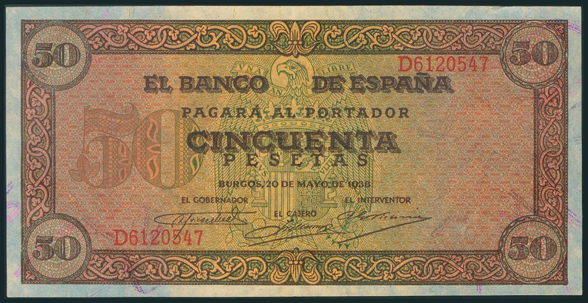 50 Pesetas. 20 de Mayo de 1938. Serie E. (Edifil 2017: 431a). Apresto original. EBC+.