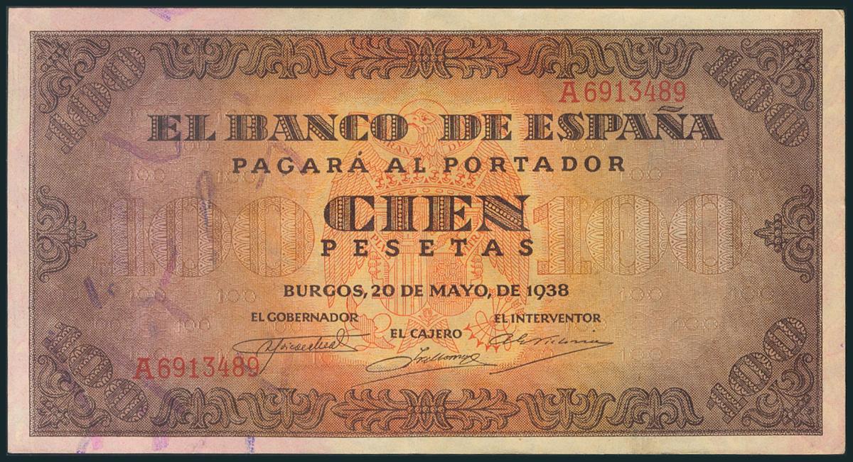 100 Pesetas. 20 de Mayo de 1938. Serie A. (Edifil 2017: 432). EBC.