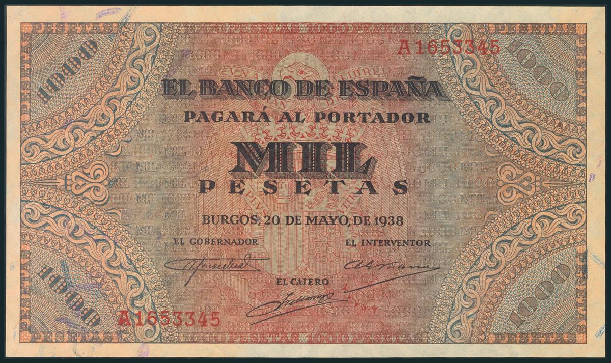 1000 Pesetas. 20 de Mayo de 1938. Serie A. (Edifil 2017: 434). Conserva gran parte del apresto original. EBC.