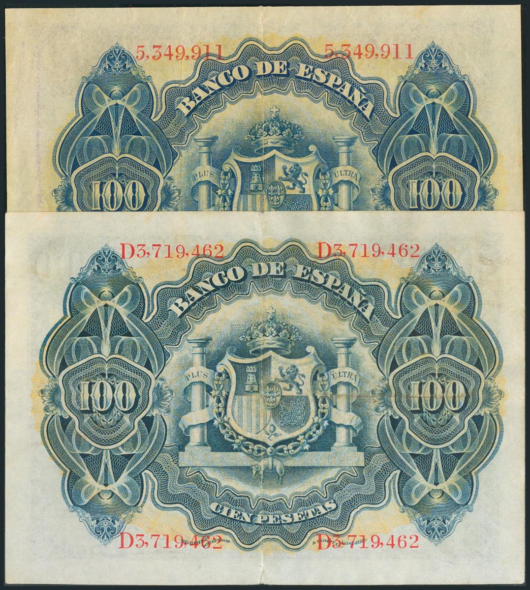 Conjunto de 2 billetes de 100 Pesetas emitidos el 30 de Junio de 1906, sin serie y serie D (Edifil 2017: 313, 313a). MBC.