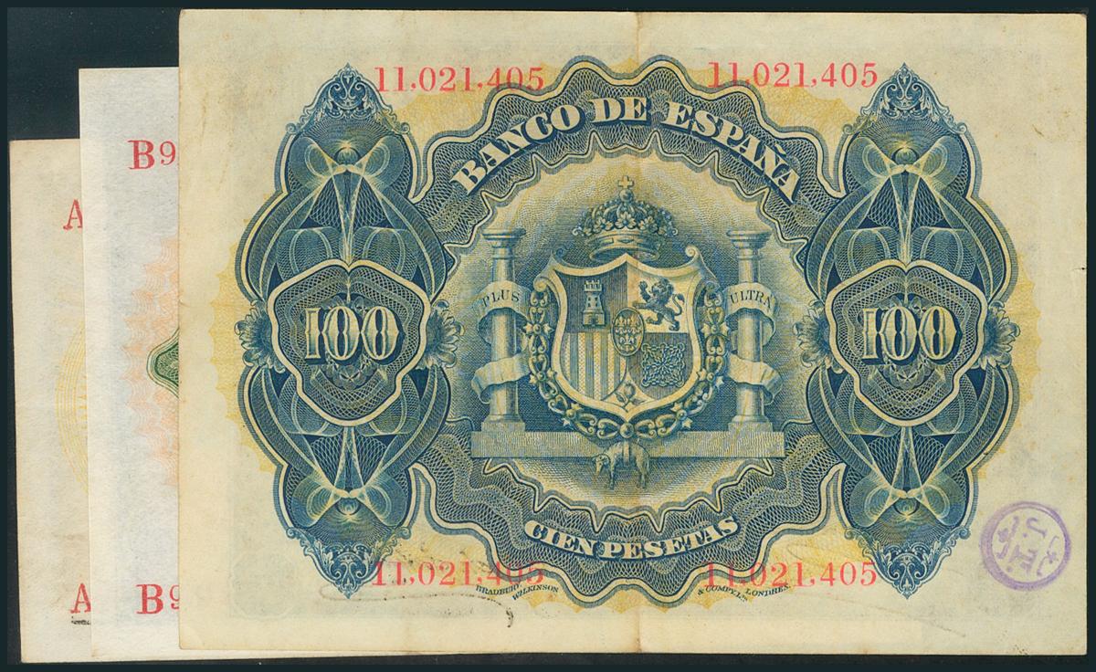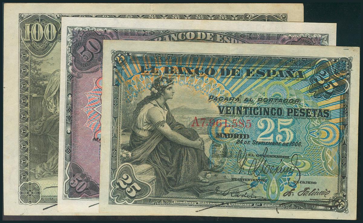 Serie completa de la emisión de 1906 con las series A, B y sin serie correspondientes a los valores de 25, 50 y 100 Pesetas. (Edifil 2017: 313, 314a, 315b). MBC+/MBC.
