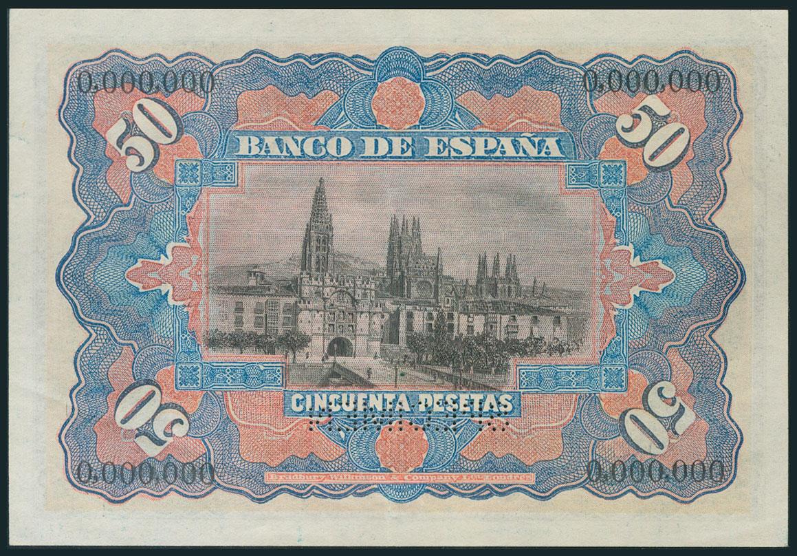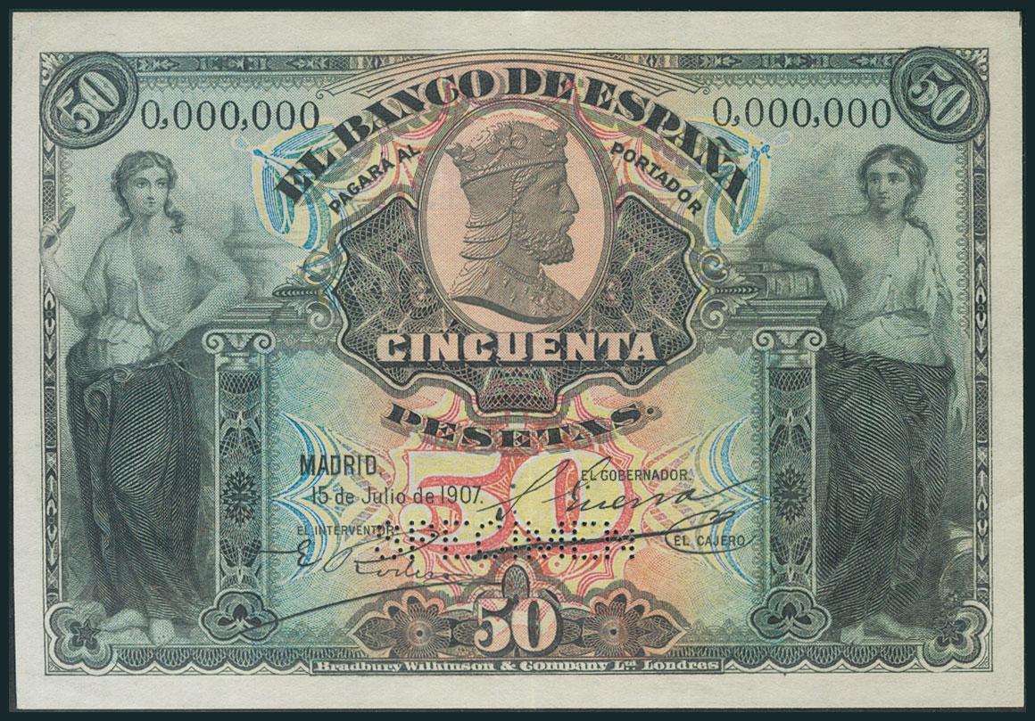 50 Pesetas. 15 de Julio de 1907. Numeración 0,000,000 y taladro SPECIMEN. (Edifil 2017: 319). Muy raro. EBC.