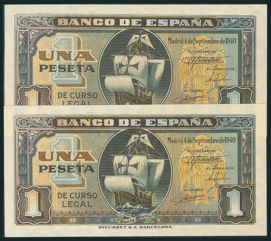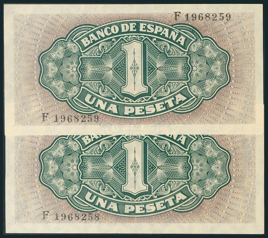 1 Peseta. 4 de Septiembre de 1940. Pareja correlativa. Serie F. (Edifil 2017: 442a). SC/SC-.