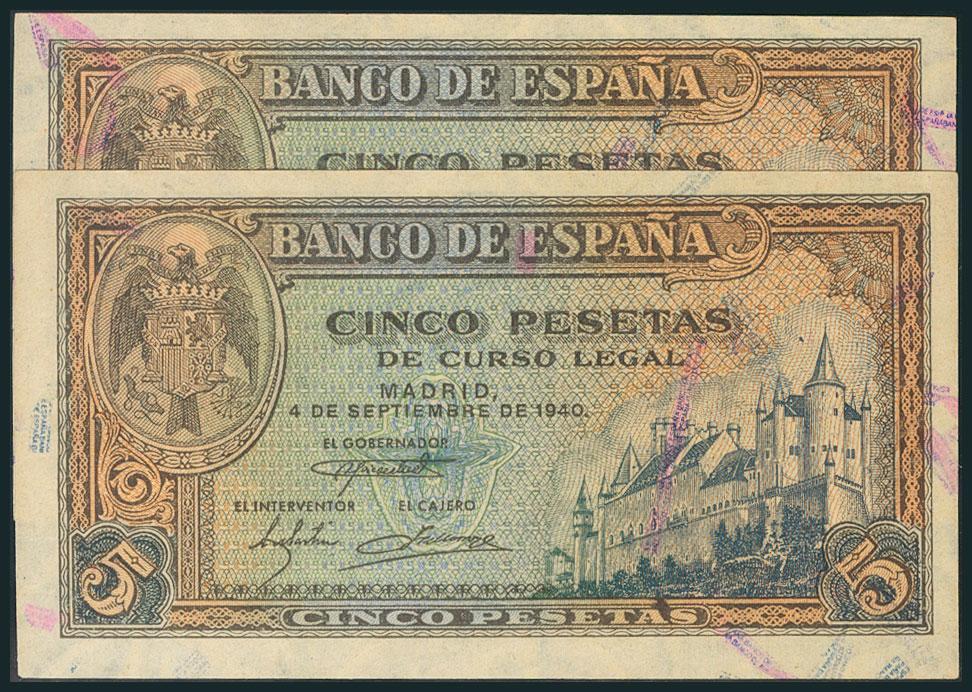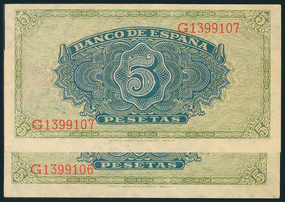 5 Pesetas. 4 de Septiembre de 1940. Pareja correlativa. Serie G. (Edifil 2017: 443a). Apresto original. SC.