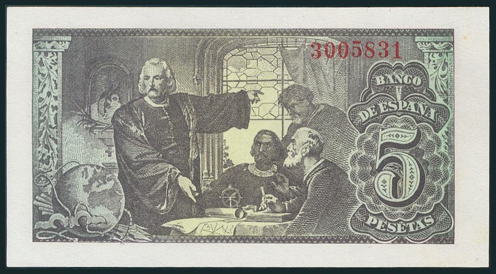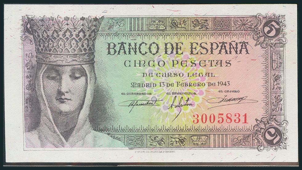 5 Pesetas. 13 de Febrero de 1943. Sin serie. (Edifil 2017: 446). SC.