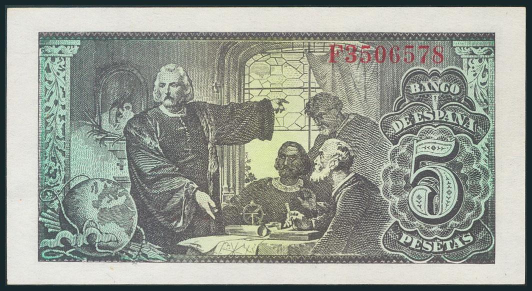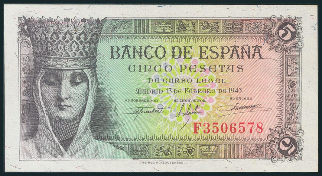 5 Pesetas. 13 de Febrero de 1943. Serie F. (Edifil 2017: 446a). SC-.