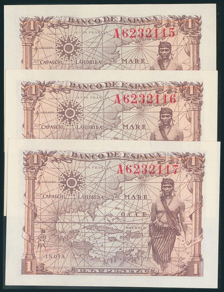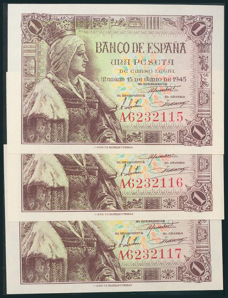 1 Peseta. 15 de Junio de 1945. Trío correlativo. Serie A. (Edifil 2017: 448a). Apresto original. SC.