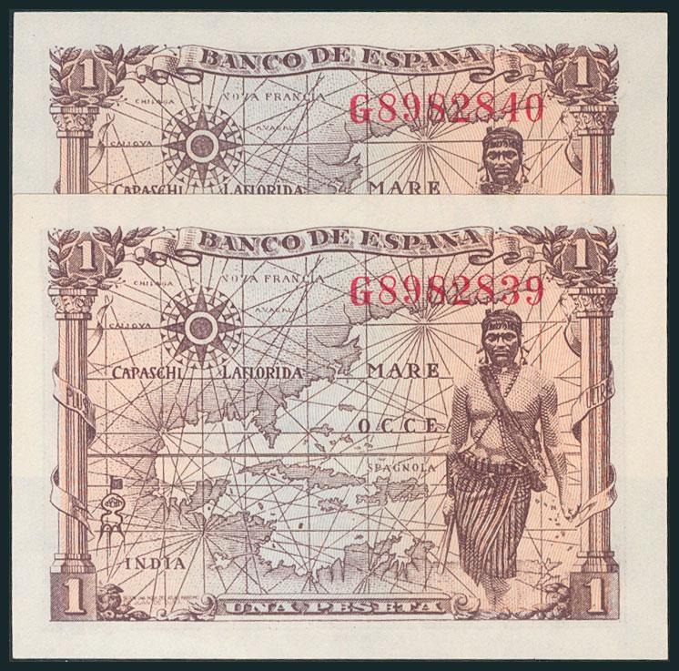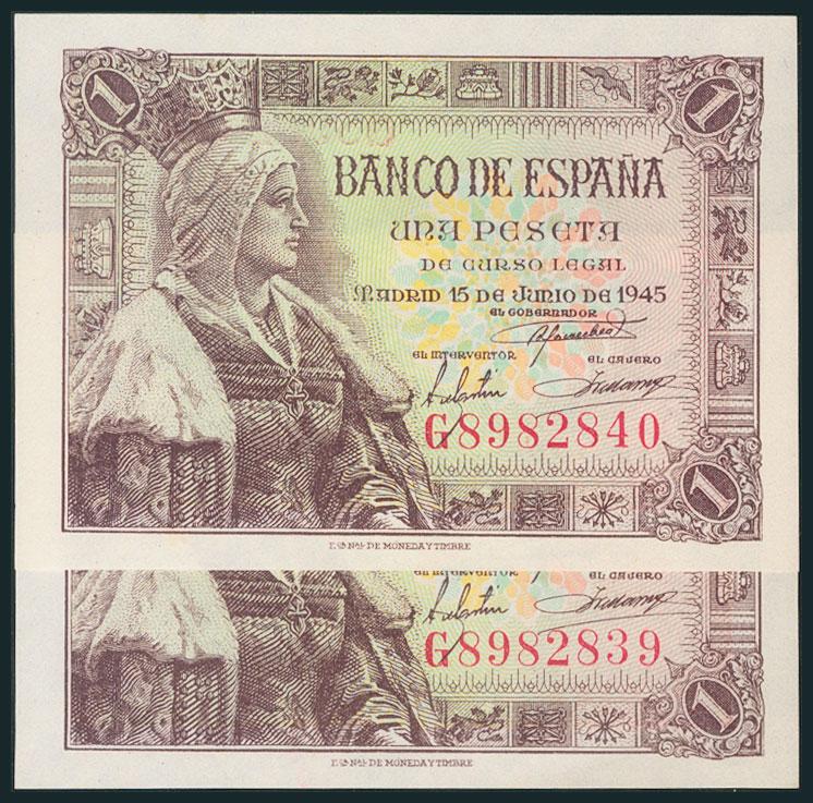1 Peseta. 15 de Junio de 1945. Pareja correlativa. Serie G. (Edifil 2017: 448a). Apresto original. SC.