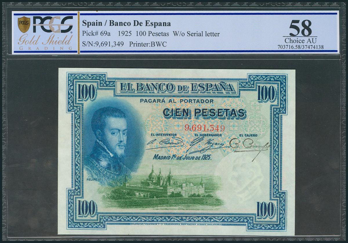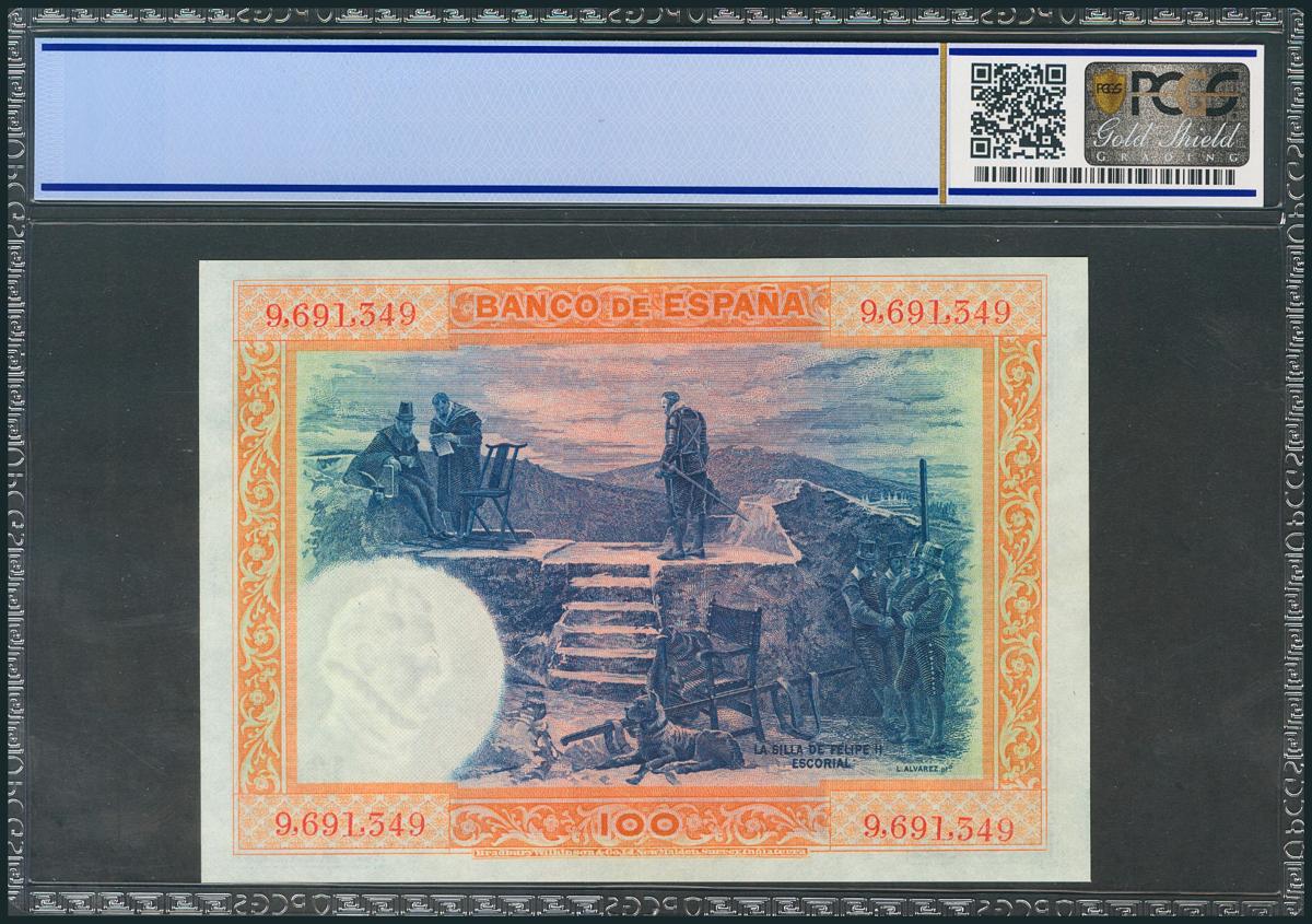 100 Pesetas. 1 de Junio de 1925. Sin serie. (Edifil 2017: 323). Encapsulado PCGS58. Inusual. EBC+.