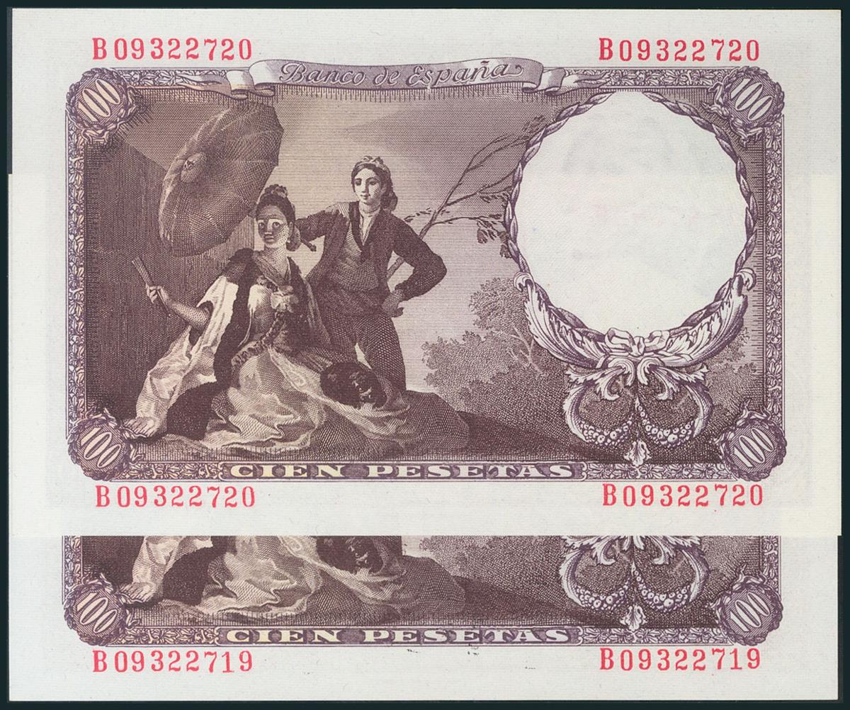 100 Pesetas. 19 de Febrero de 1946. Pareja correlativa. Serie B. (Edifil 2017: 451b). Apresto original. SC.