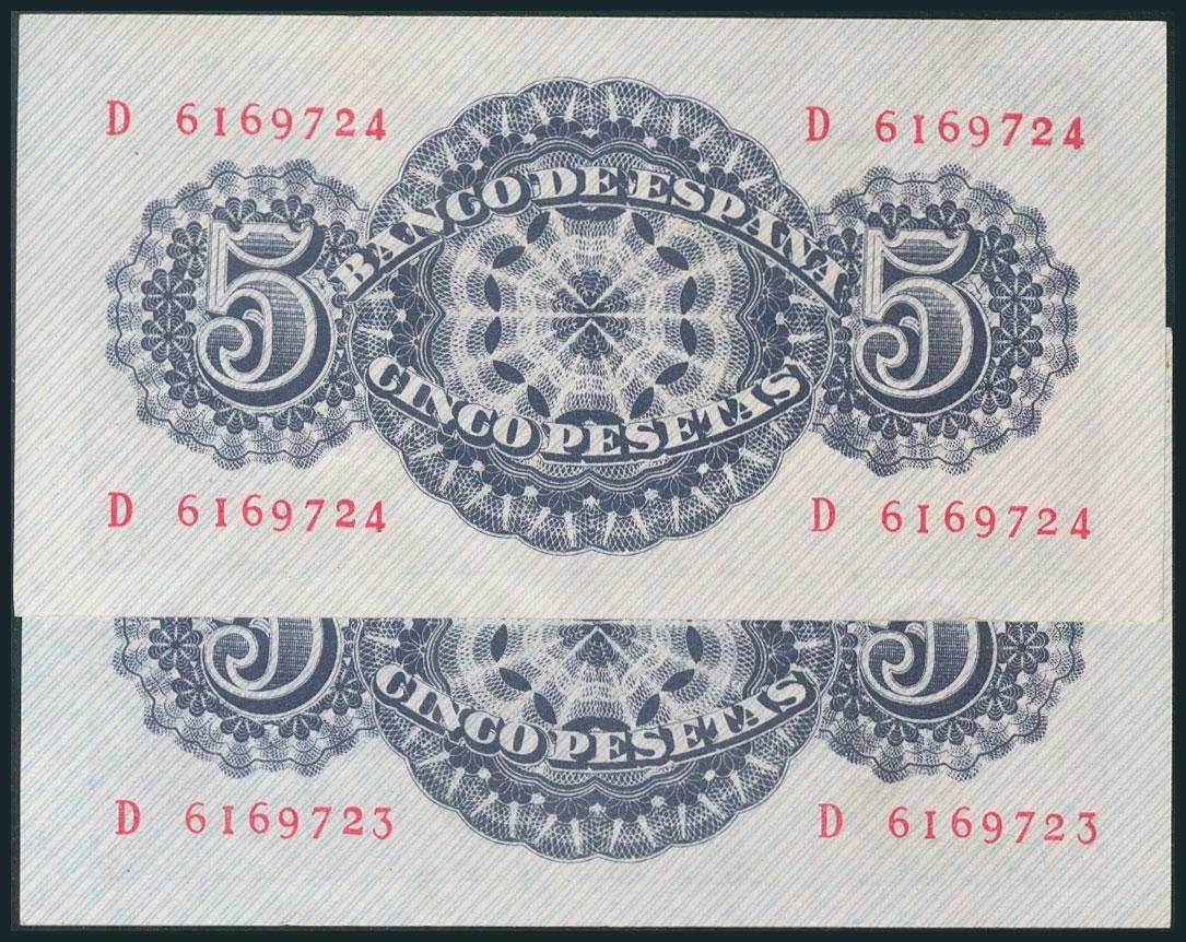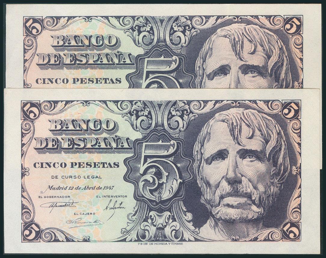 5 Pesetas. 12 de Abril de 1947. Pareja correlativa. Serie D. (Edifil 2017: 454a). EBC.