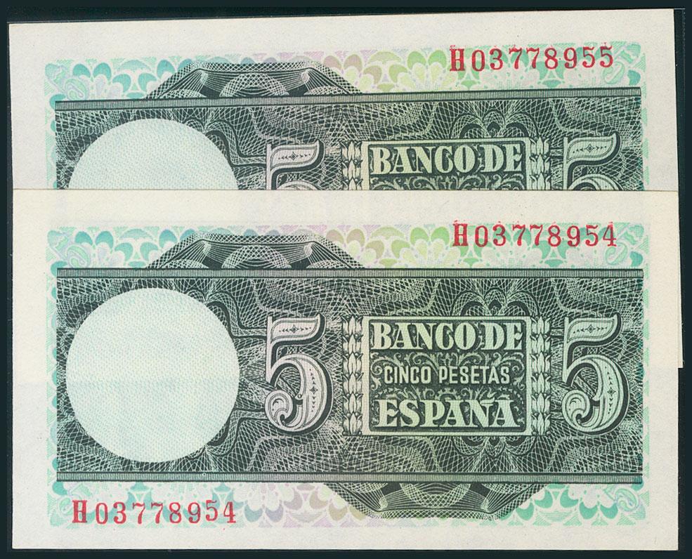 5 Pesetas. 5 de Marzo de 1948. Pareja correlativa. Serie H. (Edifil 2017: 455a). Apresto original. SC-.
