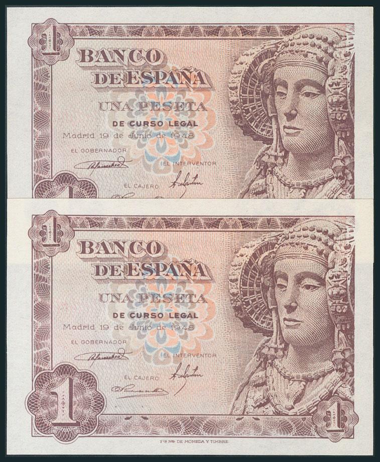 1 Peseta. 19 de Junio de 1948. Pareja correlativa. Serie E. (Edifil 2017: 457a). Apresto original. SC.