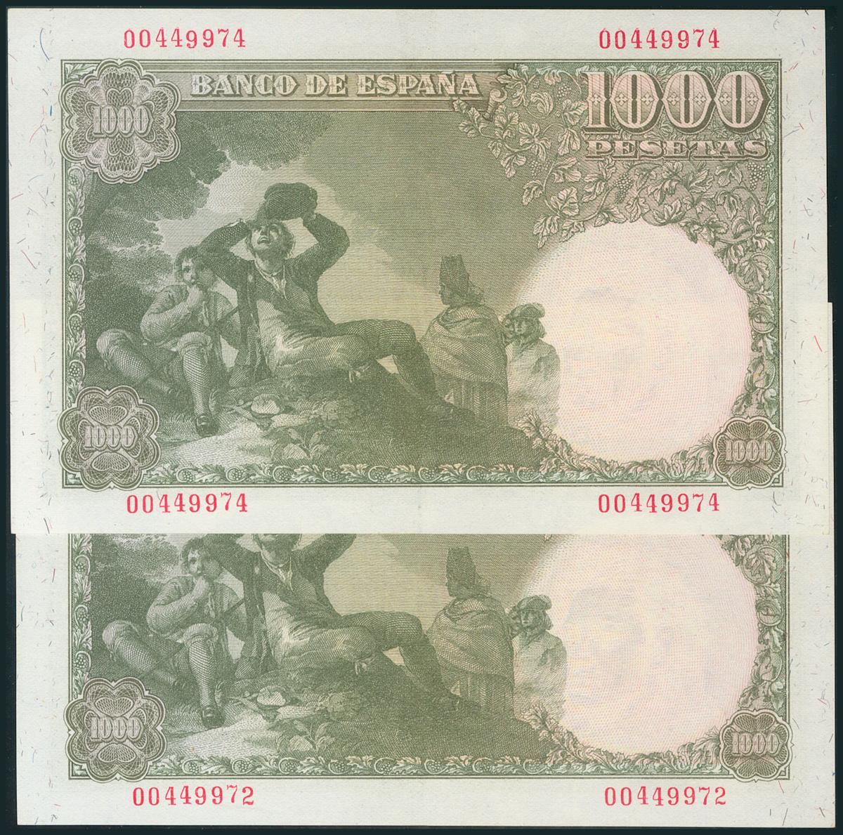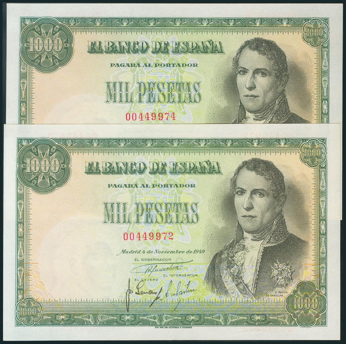 1000 Pesetas. 4 de Noviembre de 1949. Pareja casi correlativa. Sin serie. (Edifil 2017: 458). Conserva todo su apresto original. EBC+.