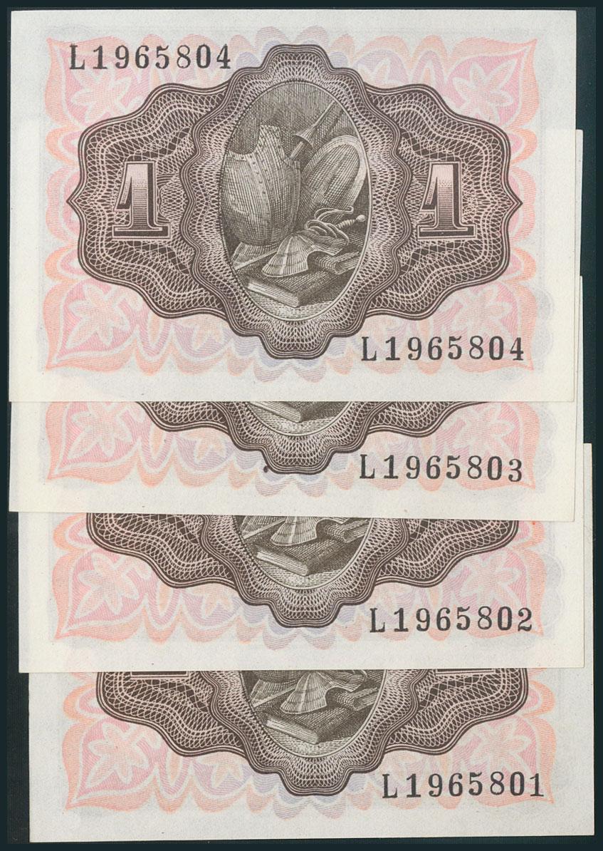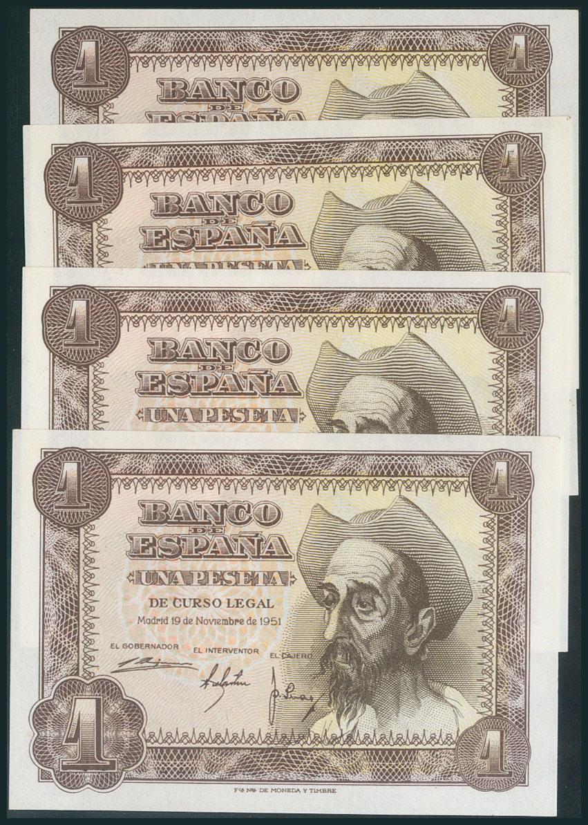 Conjunto de 4 billetes correlativos de 1 Peseta, emitidos el 19 de Noviembre de 1951 con la serie L. (Edifil 2017: 461). SC.