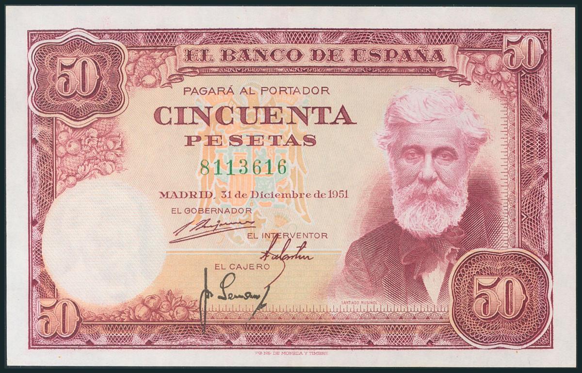 50 Pesetas. 31 de Diciembre de 1951. Sin serie. (Edifil 2017: 462). Apresto original. EBC+.