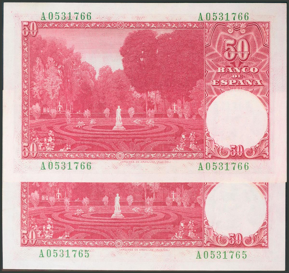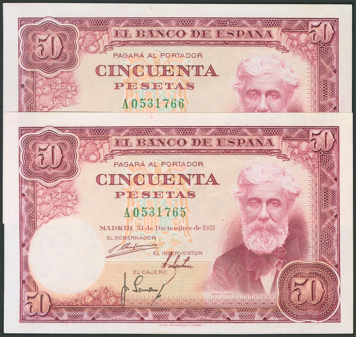 50 Pesetas. 31 de Diciembre de 1951. Pareja correlativa. Serie A. (Edifil 2017: 462a). Apresto original. SC-.